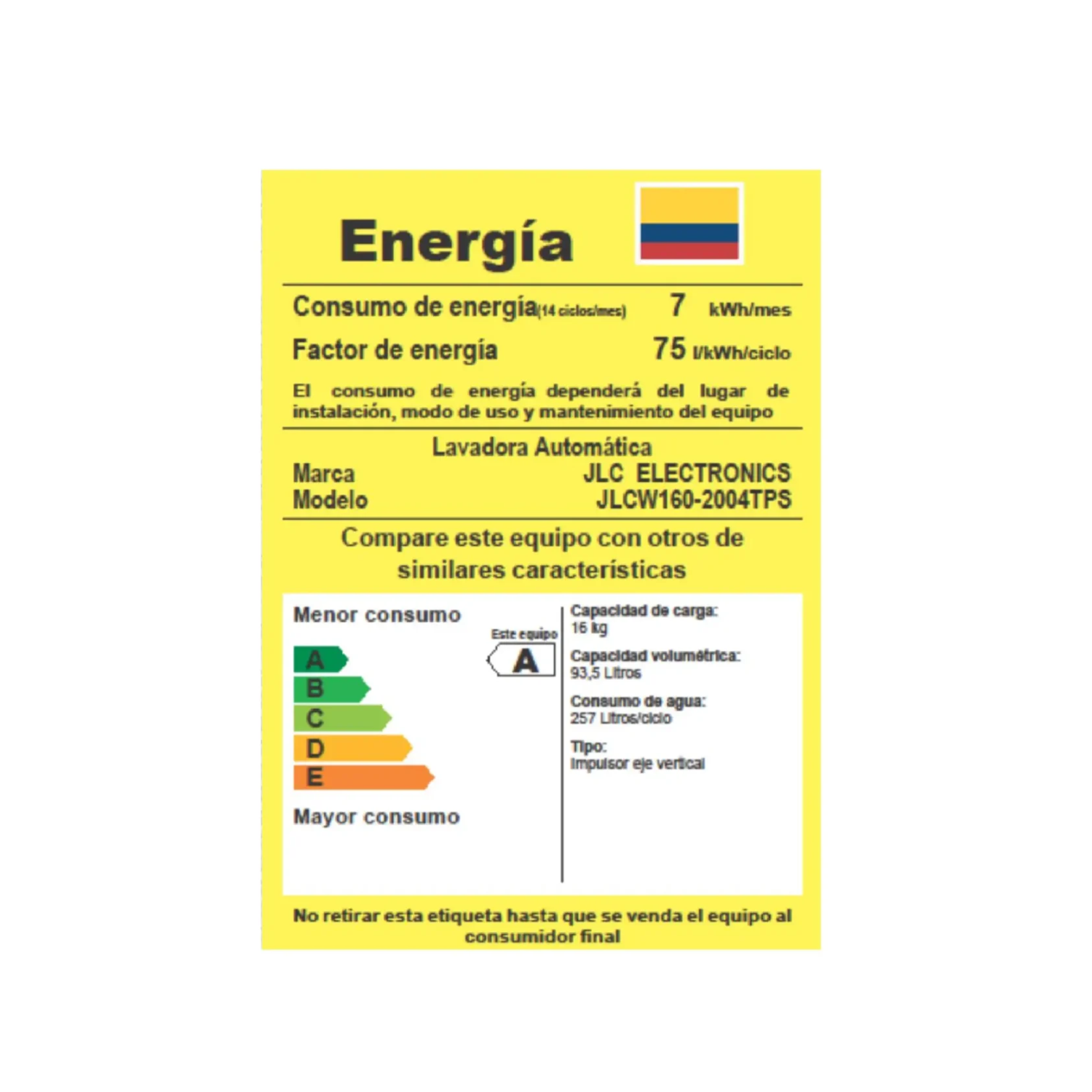 | Factor de energía | 75 L/kWh/ciclo |